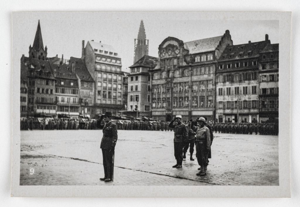 Et c’est le 23 novembre 1944 que les premiers blindés de la division du Général Leclerc entrent dans Strasbourg. Après avoir traversé les Vosges, les troupes françaises arrivent par Schiltigheim, et traversent la ville depuis la place de Haguenau. Cependant, des contre-offensives sont encore menées dans la région à ce moment-là. La première Armée Française défend la zone. Et cinq mois plus tard, le 16 avril 1945, le Général de Lattre de Tassigny entre dans Strasbourg, depuis la ville de Kehl, mettant fin à toutes les menaces ennemies. (Source : Compte-rendu de l’administration, 1935-1945, Archives de Strasbourg BA 4).