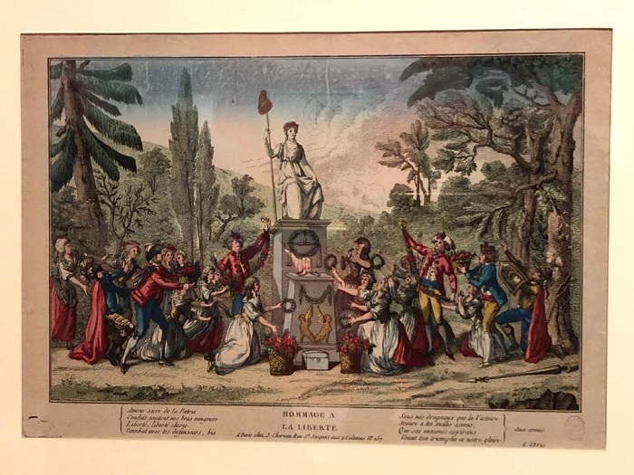 Témoin de ces fêtes qui popularisent ce chant, une eau-forte coloriée, signée Carnavalet, de la fin du XVIIIe siècle. La Marseillaise, incarnation de la liberté, y a les traits d'une femme à l'allure antique et altière.